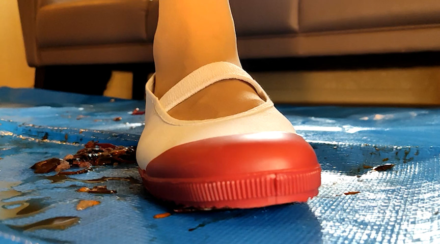 今度のあみちゃんは現役といっても良いくらい似合っている体操服に清楚がよく似合う上履きでのザリガニ踏み潰し。真っ赤な靴底がザリガニを襲う。ギザギザの靴裏に捕まれば逃げ場は無し、逃げるザリガニを足で近くまで持ってきて透かさず踏み潰し、まだ動いていたら靴底全体でとどめを刺す。ブルーシートには、体液が飛び出してどんどん汚くなっていきます。左右に動かして原型を無くし、どうしたら完全に潰れるかコツも掴んだ様子。最後は真横から眺めている様な超接近映像も収録。永久保存の上履きバージョン。