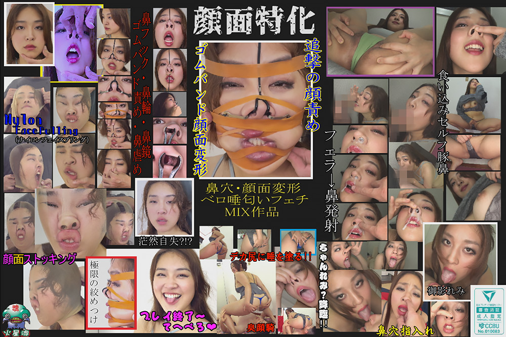 夢の中に現れたアへ顔鼻穴女神「御影れみ(みかげれみ)」。恥ずかしいケツ穴を嗅がせて興奮した変態おじさんをフェラから鼻穴発射へ。鼻フック・鼻輪で伸ばした鼻穴を鼻鏡で奥まで観察(鼻毛収録)。3方向鼻フック+ゴムバンド顔面責めで鼻穴虐め。顔面ストッキングで強烈なつり目・ブタ鼻・唇めくれ。ケバ痴女に変わってデカ尻に唾塗り込み臭顔騎。男の鼻に痰を塗り込んで乾かし臭い責め。鼻フェラ・ベロ根本押し付けでたまらず発射。個撮では生ベロ味わい+鼻穴指入れとセルフブタ鼻で挑発。涎垂らしアへ顔を晒す彼女の鼻穴・顔面フェチとベロ唾臭いフェチMIX作品。