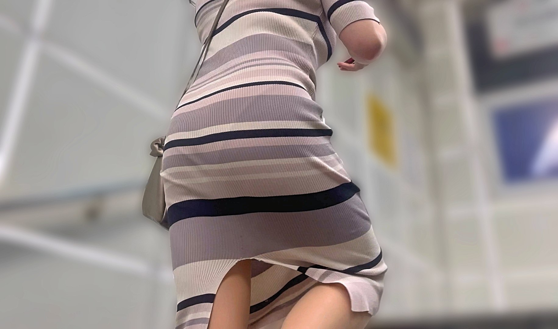淡いブルーのスカートのおかげで、フルバックのパンティラインが浮き上がりクビレボディも相まってスケベな後ろ姿で最高です。