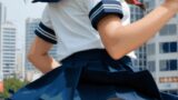 最後は屋外の階段を上っていった、そして上ってるときはまさかの風で、スカートが舞い上がり、お尻が丸見え!!
