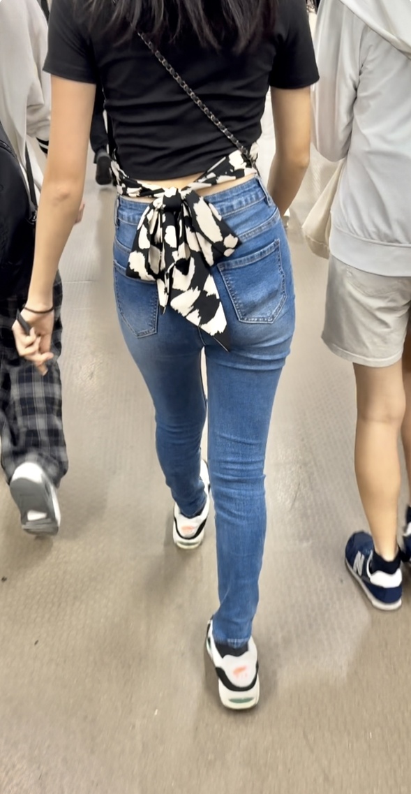 すらっと伸びた手足にプリッとしたスレンダーなデニム尻がgood!トップスの背中が空いてて見えてるところもかわいいです早足で歩く時のデニムの感じをお楽しみください!