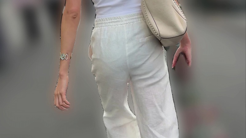 テロテロの白いズボンから意識低目なフルバックのパンティーが透け透けに透けています。