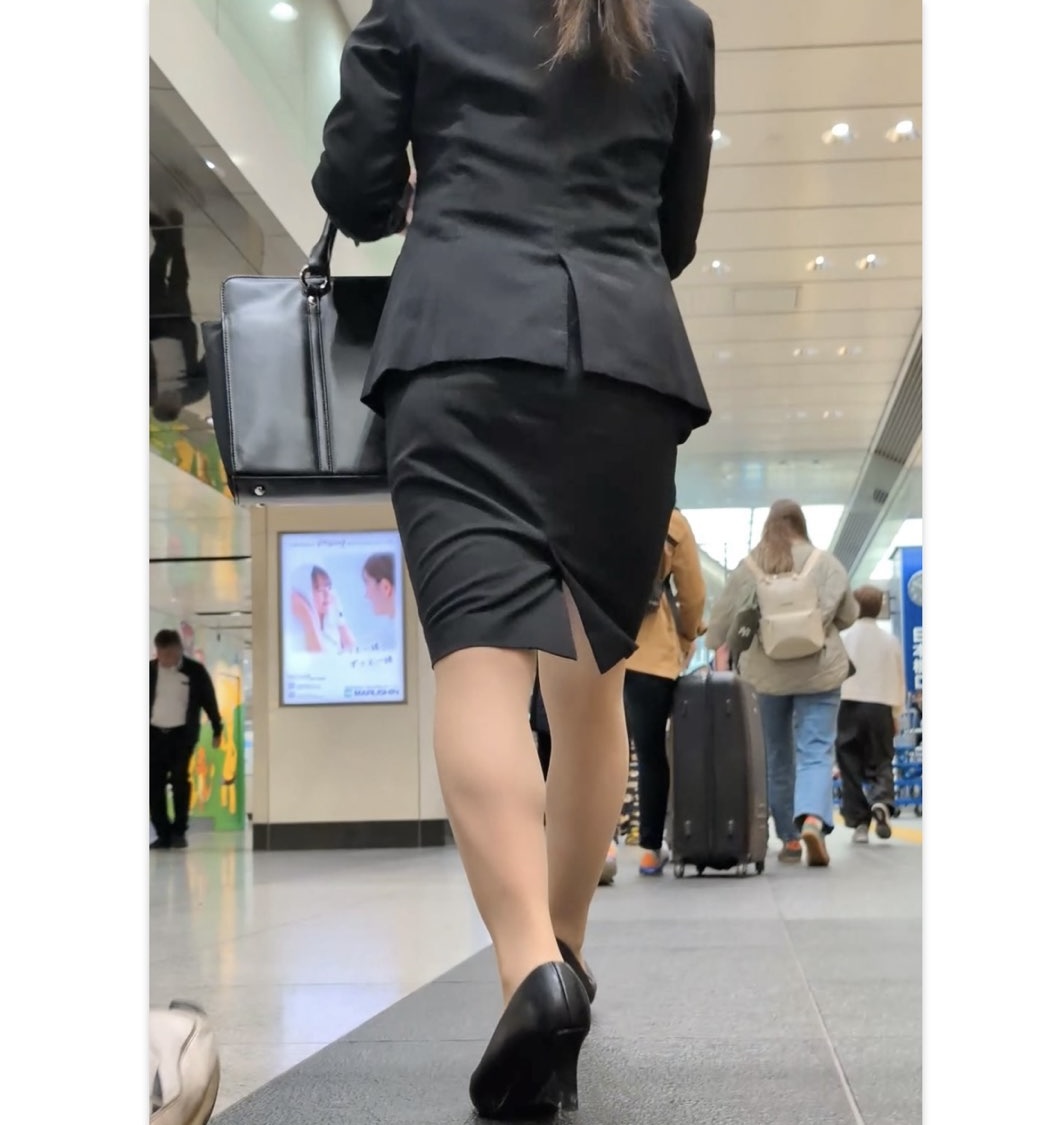 3人目は大型駅にて遭遇したリクルートスーツOLさん!膝上のタイトスカートにピチッとした薄手の質感がたまりません。歩くたびに素晴らしい陰影を見せてくれるので、グイグイと寄ってみました。