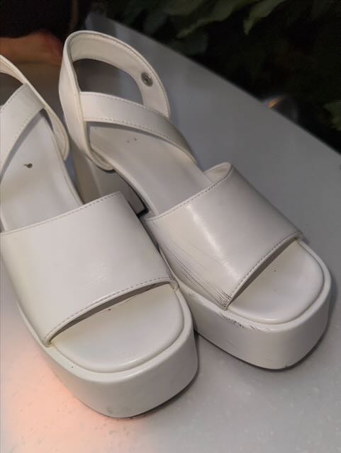 5枚は脱いでもらったサンダルのみの接写の写真になります。白のサンダルなので履いているうちについた傷などもみやすくなっています。