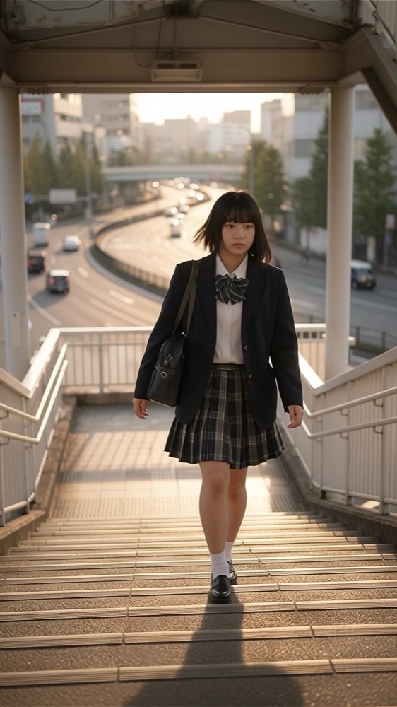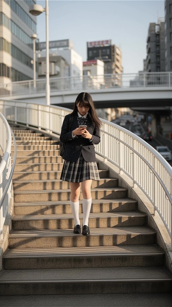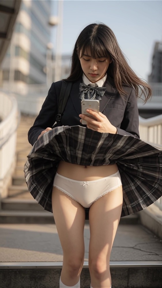 歩道橋で少し風が吹いてパンツを見せてくれる女の子