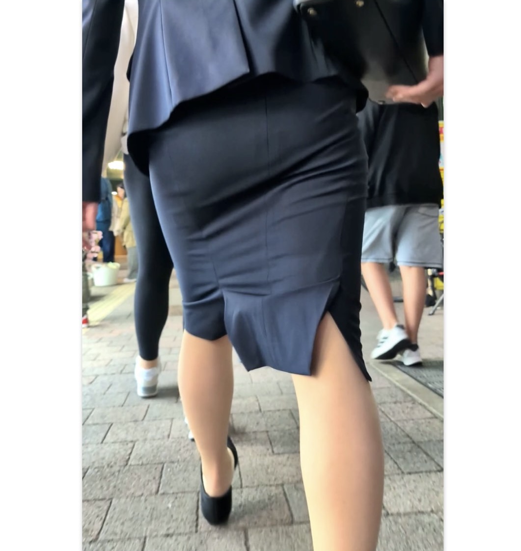 一見すると膝丈のタイトスカートで控えめなルックかと思いきや、歩行時の後ろ姿はかなり艶かしいシルエット…。