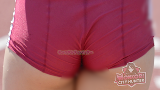 冒頭はスタート練習を終えてクラウチング台に戻るシーンから始まります!そのためパンツ姿を正面からじっくりと見ることができました!スタート練習後だったのですでに良い食い込みでしたよ!練習後は直接スタート位置には戻らず寄り道して水を汲むシーンも!その時あわや胸ちらしそうな体勢にも!ご褒美ありがとうございます!
