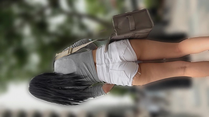 美脚もさることながら、角度の際どいホットパンツからは、収まりきらない下尻がはみ出しています。