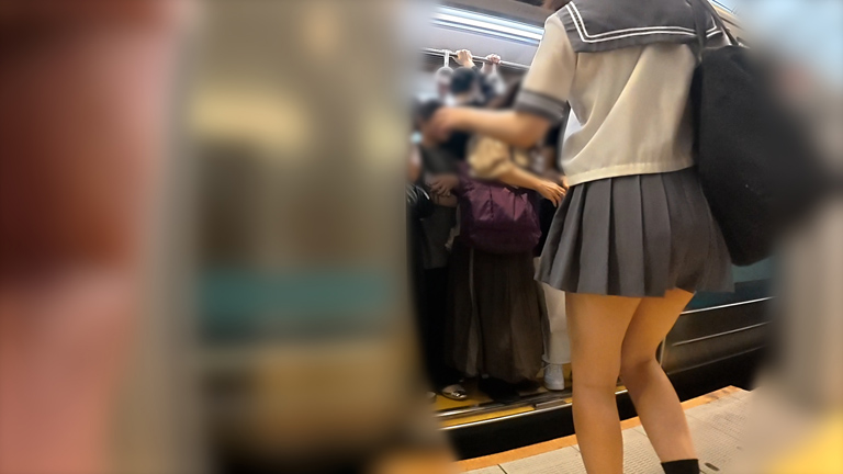 夕方のラッシュ時、混雑する車両に乗り込むところを後ろからノッコミ。