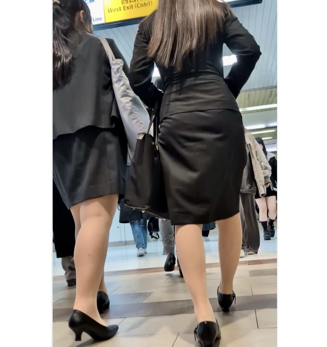 1組目は混雑する駅構内で遭遇した2人組のリクルートスーツOLさんコンビ。右を歩くOLさんがパツっとした膝丈のスカートかつ、ジャケット含めて腰回りがやけに艶かしく…。ポケットに手を入れているからかもしれませんが、おかげで腰回りからお尻にかけてがしっかり強調されていて素晴らしいです。相方もムッチムチの膝上5センチのスカートでこちらもなかなか!