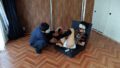 会場近くに到着したワゴン車の中から楽器を取り出しながらアンスコを見せています。