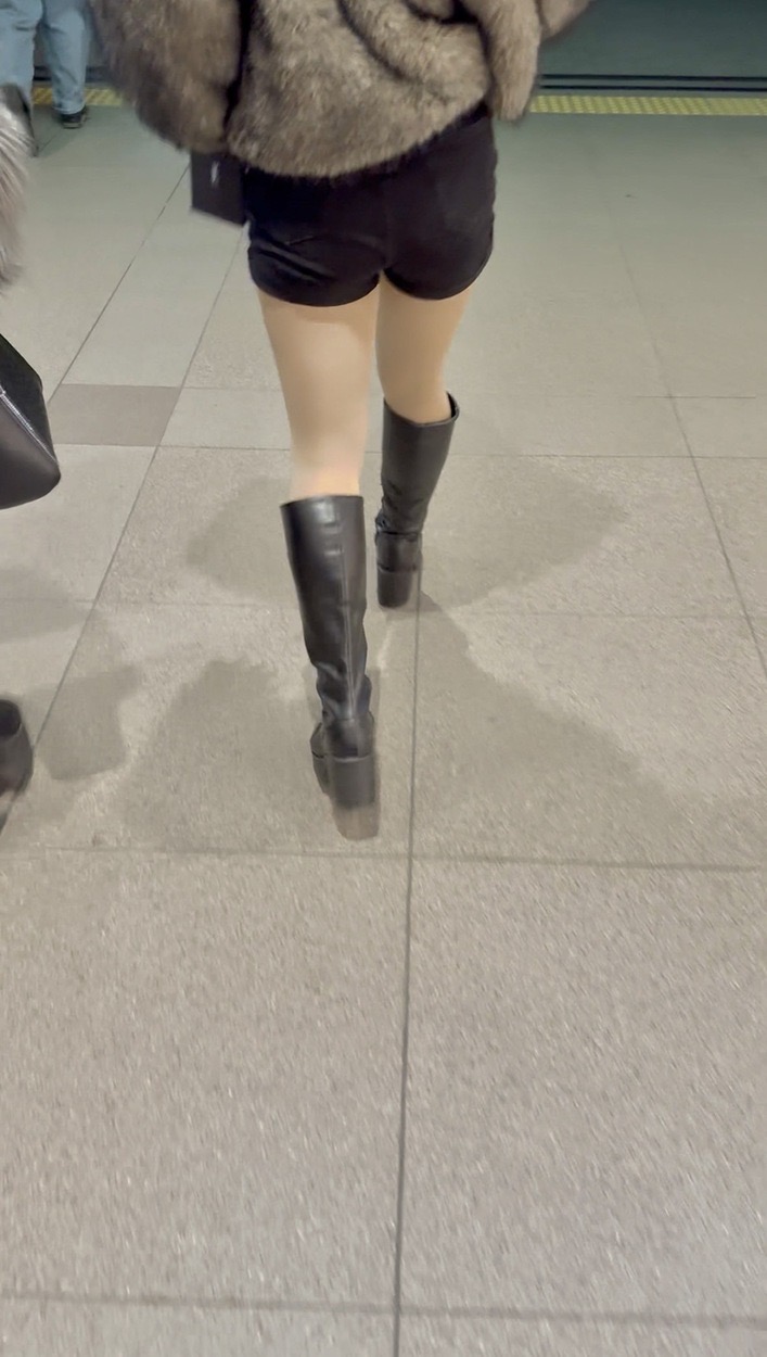 黒の生足ショートパンツのお姉さんと淡いブルーのスキニーデニムのお姉さん達