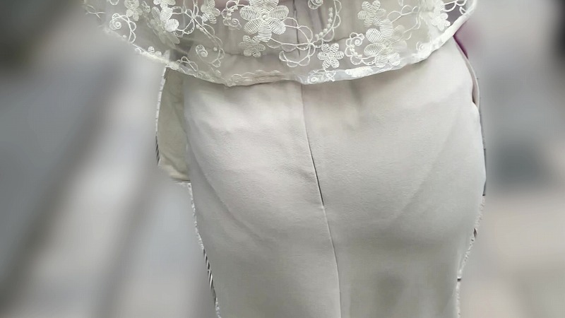 白いスカートがよく似合う、清楚系のお姉さんに撮影させていただきました。トップスはシースルーですが、上下白の清楚な雰囲気のお姉さん。インナーを履き忘れたのか、柔らかい素材感のスカートからフルバックのパンティーが透け透けになっています。