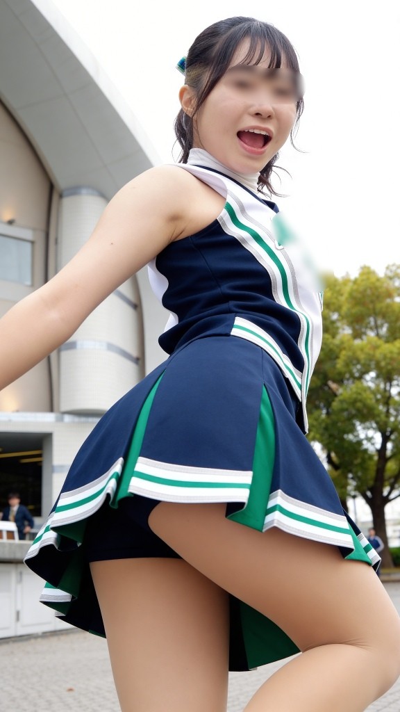 背景のモダンな建物が現場の臨場感、汗ばむ肌の質感、風に舞うポニーテール、スカートのフレアが織りなす躍動感…