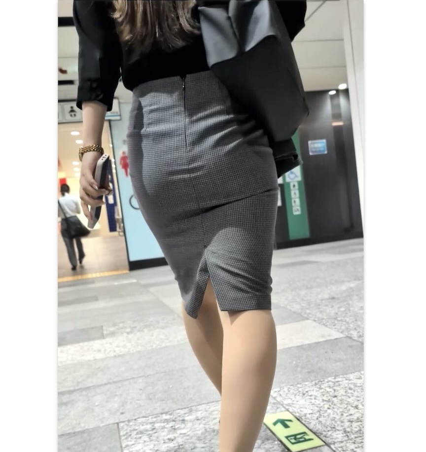 チェック柄の高級感のあるムッチムチのタイトスカートをこれでもかと見せつけつつ、長い髪と高スタイルのその身体で周囲を魅了しながら歩いています。