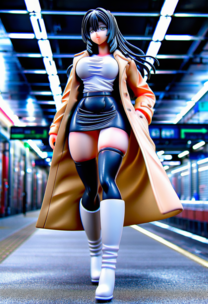 【フィギュア風】疲れた大学生の帰宅途中2 ~市営地下鉄の階段を上る彼女~ 白T×トレンチ×黒レザースカート×白ブーツ黒ニーソ