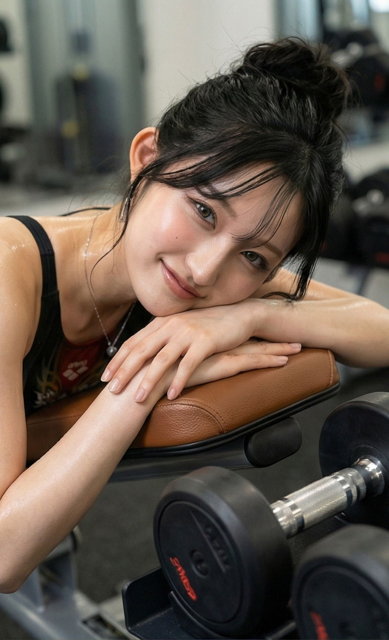 今の韓国系フィットネスの「爽やか高身長マッチョ」なイメージを掛け合わせたクールな瞳に長い黒髪がセクシーな最高にカッコいいスーパーお姉さん。AIで生み出された超絶セクシー美女です。