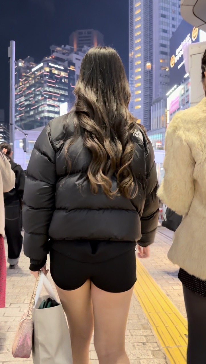 1人目(表題)はノースフェイスのダウンに黒のショートパンツコーデのお姉さん!