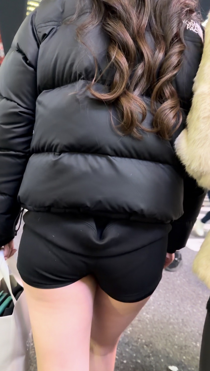 1人目(表題)はノースフェイスのダウンに黒のショートパンツコーデのお姉さん!