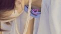 白いブラウスの女性。肛門をグッと左右に拡げられると、横長の形に肛門が開いてしまいます。