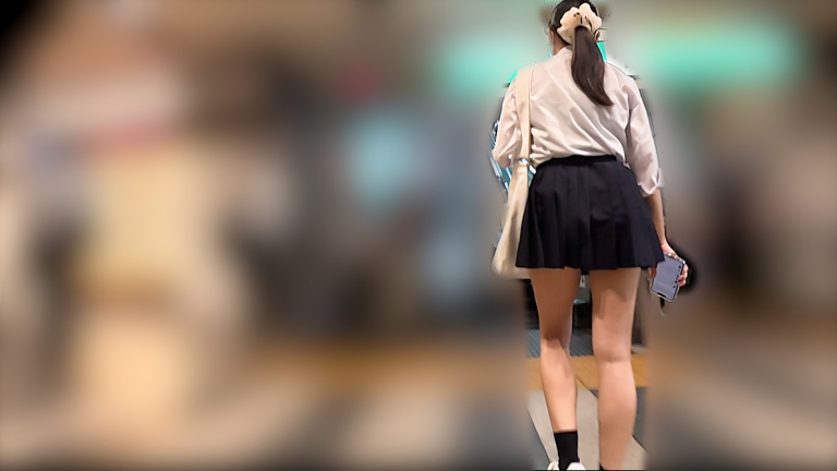 降車後、ホームで歩いているところを追跡し、スカートを捲ると、