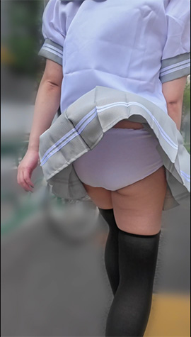 重いカメラを足に付けられたまま、イベントでもない街中でセーラー服コスプレで歩かされ、めちゃくちゃ恥ずかしそうな表情。
