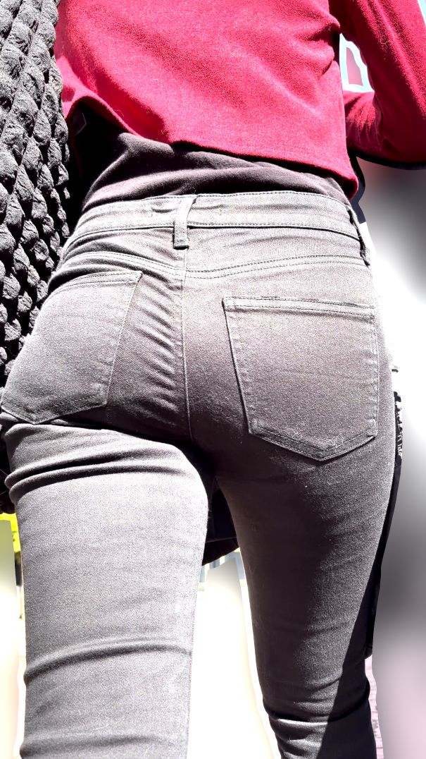 移動中の何気ない後ろ姿に潜む、隠しきれない色香。漆黒の生地を押し広げる、プリプリとしたお尻の弾力と、スキニー越しに覗く秘密のラインを、存分にご堪能ください。