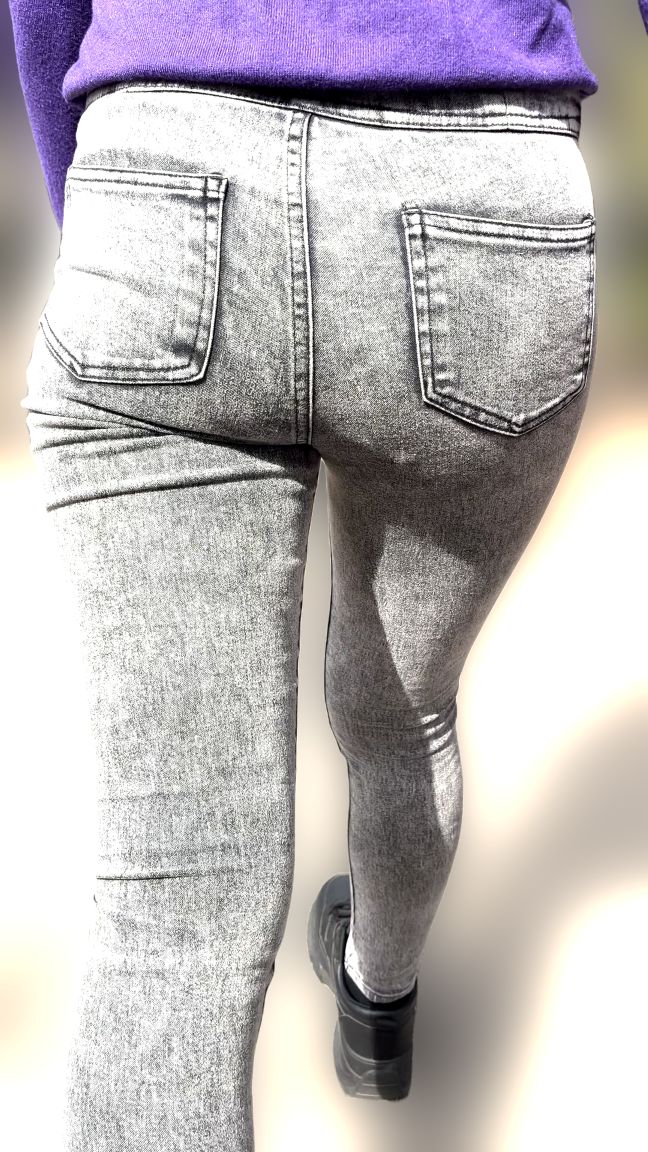 ダークな色彩の上半身と、膨張色で強調された下半身のコントラストが、肉感的な歩行を生々しく引き立てます。リズミカルに腕を振りながら進む彼女の、スキニー越しに躍動する極上の”揺れ”をじっくりとお楽しみください。