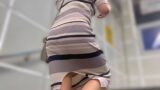 電車内対面からの全身、そして艶やかな太ももの間から覗く白パンティ